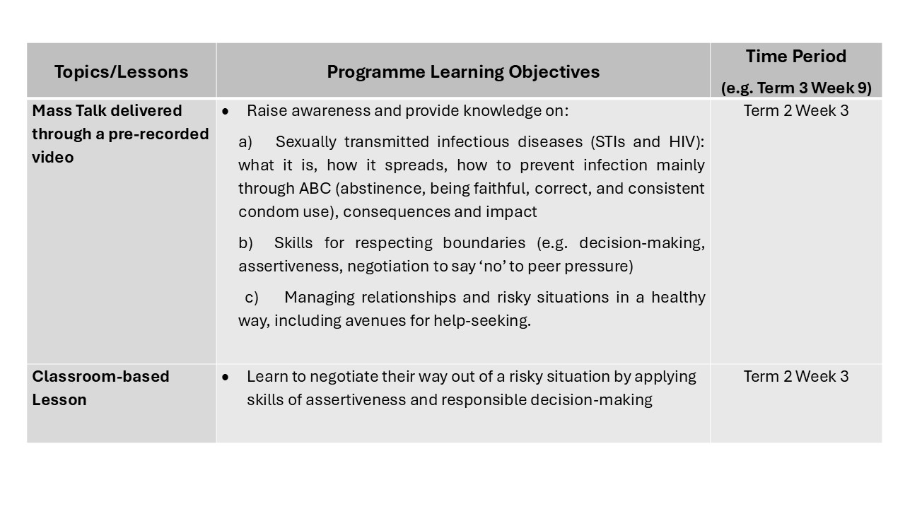 9. Students are taught skills such as decision-making, assertiveness and negotiation to say “no” to sex and negative peer pressure. They also learn that the impact of STIs/HIV extends beyond themselves and involves their family, and the importance of responsible decision-making and seeking help. Abstinence and upholding family values are the key messages.